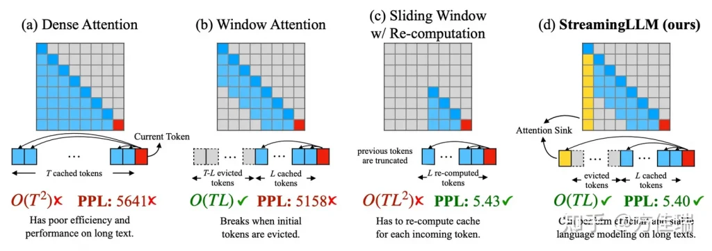 StreamingLLM的另一项重大突破是他们提出了「attention sink」概念,这被认为是解决以上挑战的关键。简单来说,」attention sink」是一个技术,它将注意力集中在最近的上下文中,而非全部的上下文。这种方法大大节省了内存和计算资源,克服了KV Cache的限制,而且它使得模型可以处理无限长度的输入输出,这无疑是对现有模型的重大突破。