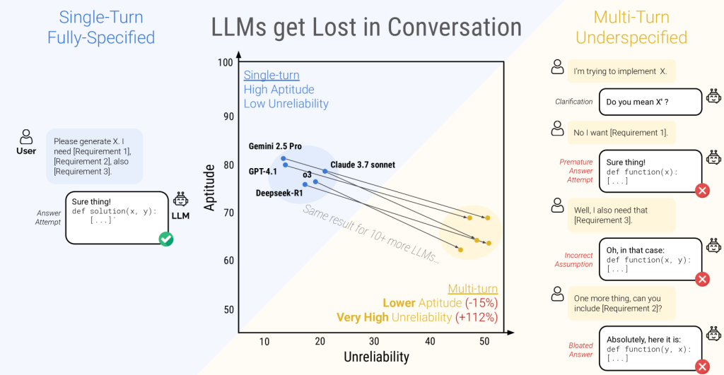 - Philippe Laban, Hiroaki Hayashi, Yingbo Zhou, Jennifer Neville. LLMs Get Lost In Multi-Turn Conversation. arXiv:2505.06120v1, 2024.