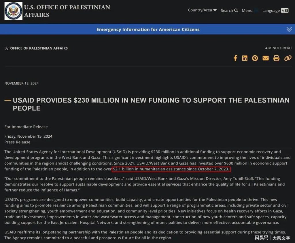 2024年11月15日,美国国际开发署(USAID)通过美国巴勒斯坦事务办公室发布了一份声明,宣布向西岸和加沙地区提供2.3亿美元的额外援助,用于支持经济复苏和发展项目。这份声明声称,自2021年以来,USAID已向巴勒斯坦投入了超过6亿美元的经济援助,而自2023年10月7日哈马斯突袭以色列以来,更提供了高达52.1亿美元的人道主义援助。