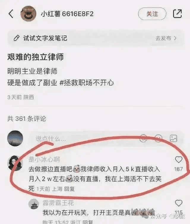 更为赤裸的迎合男性凝视的行为则是「擦边」,即带有性意味的图片、视频及直播内容。例如,有女律师博主表示自己做律师收入太低,月入5000元,但靠「擦边」直播却能月入两万元。这种现象在小红书上并不罕见,反映了女性在父权制社会中为了经济利益而被迫迎合男性欲望的现实。