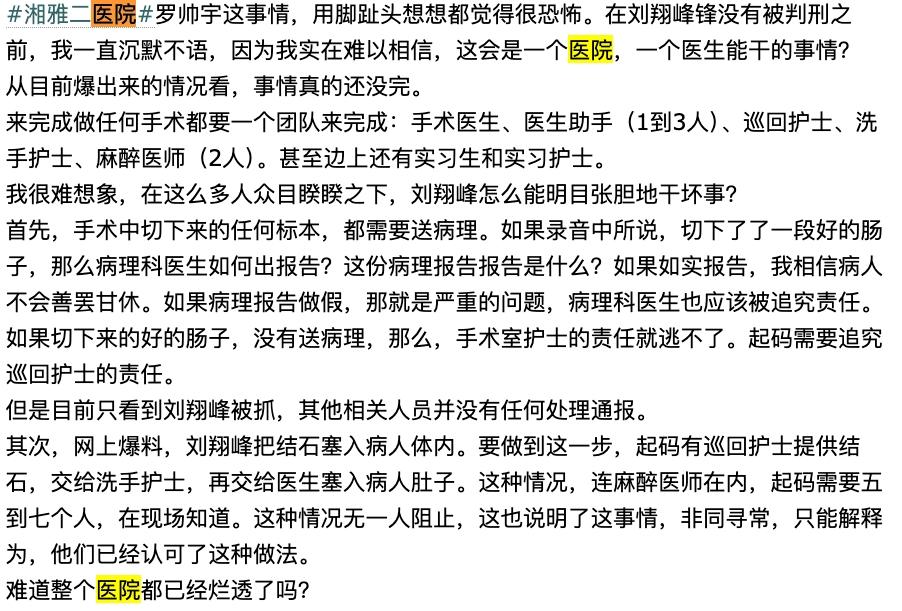- 医院反应:2025年6月13日,医院肾移植科网页信息被清空,其他科室正常,引发猜测(见突发!湘雅二医院肾移植科网页信息清零,其他科室信息均显示正常|中南大学湘雅二医院|器官移植|患者隐…)。这被视为可能掩盖问题的举动,但医院未作官方解释。