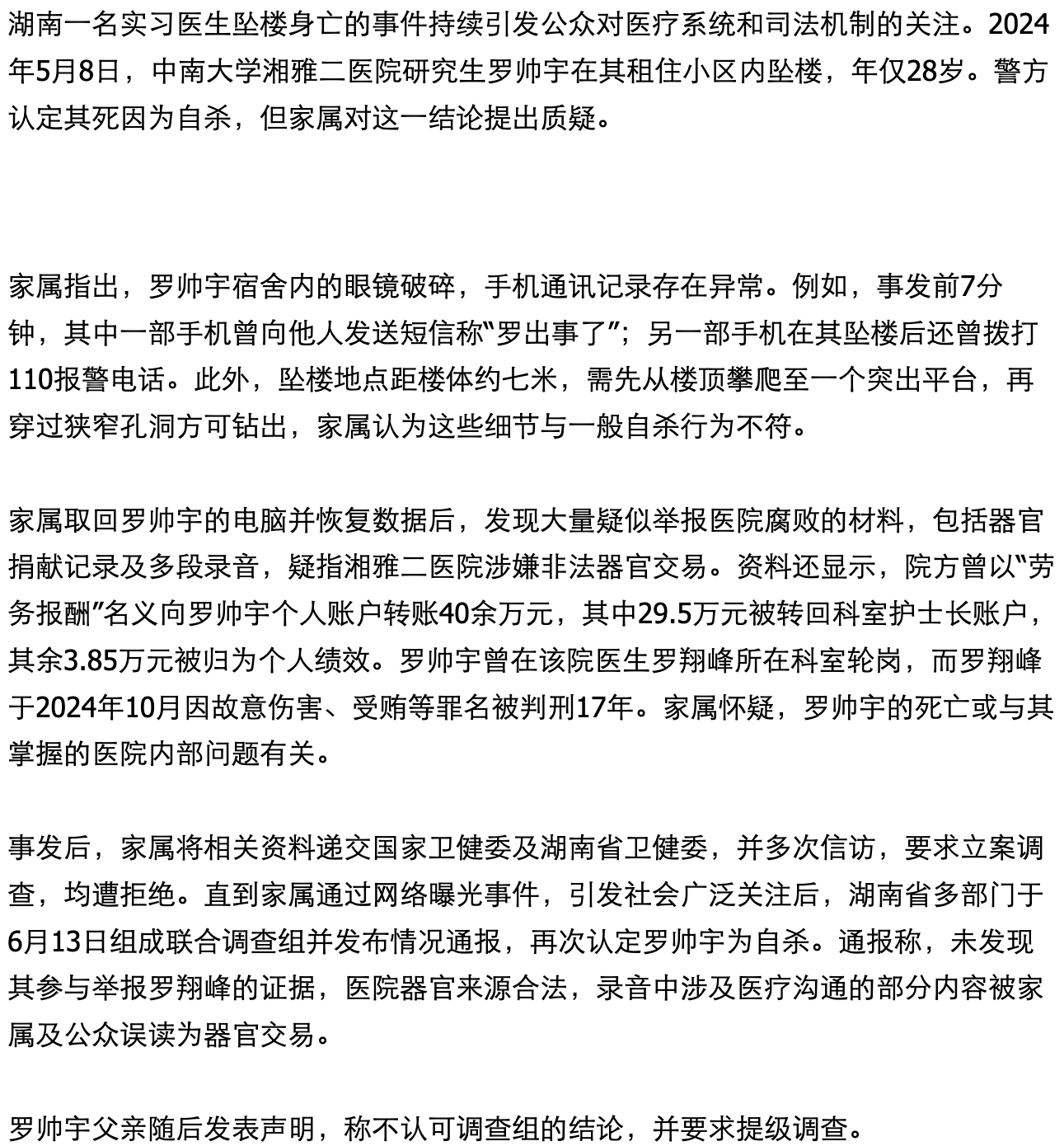 - 实习医生罗帅宇死亡事件被官方定为自杀,但家属质疑死因,呼吁更高层次调查。