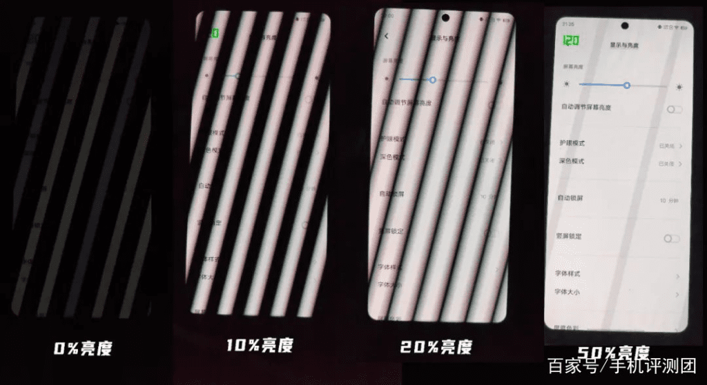 频闪是指OLED屏幕通过不断的「亮」和「灭」交替来实现调光的过程。这种频闪一般是肉眼无法察觉的,因为人眼对于80Hz以上的频闪很难察觉到。然而,即使肉眼无法察觉,频闪仍会刺激视神经并导致眼疲劳。频闪问题并不仅存在于手机屏幕上,许多商店的灯光以及其他光源也存在频闪现象。