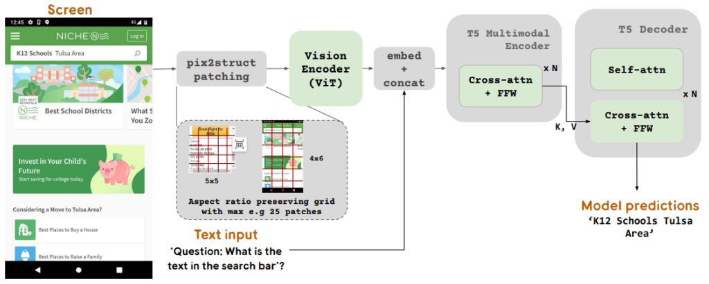 ScreenAI的基础架构借鉴了PaLI架构,并结合了Pix2Struct的灵活拼接策略,旨在处理各种格式的图像。这种模型通过将视觉任务重新构建为(文本,图像)到文本的问题,从而实现了对复杂视觉内容的深刻理解。我们在多种数据集上进行了训练,特别是创新性的屏幕注释任务,要求模型识别用户界面元素的类型和位置。这种训练使得ScreenAI不仅能够生成大规模的问题回答(QA)和用户界面导航数据集,还能进行信息摘要。