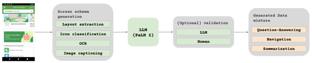ScreenAI经过多个阶段的训练:预训练时,我们利用自我监督学习生成大规模数据集,而在微调阶段,则结合人类标注的数据,针对各种任务进行优化。为了增强模型的能力,我们特别关注问题回答任务,识别出在算数、计数和复杂信息图理解等方面的性能差距,并进行了针对性的训练。