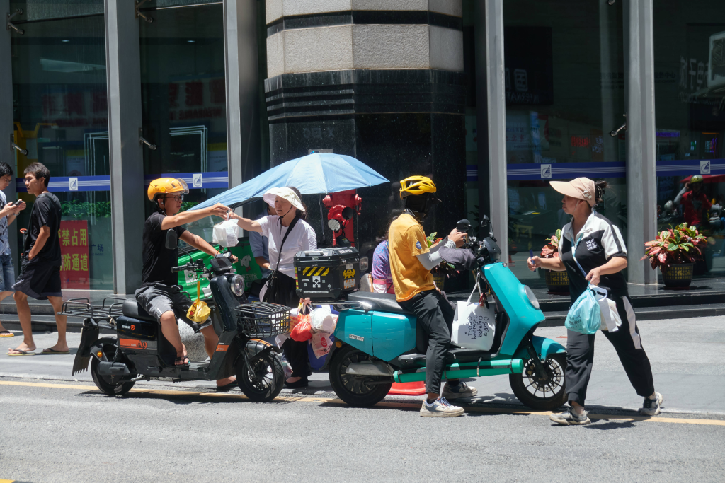 在华强北的赛格广场,52岁的谢明霞每天临近中午十二点进入战斗状态。她在车流中迅速预判外卖骑手停车的位置,飞奔过去拦下对方,催促着问「几楼几楼?」然后拽下餐盒,出示付款码,在餐袋上记下房间号,几个动作一气呵成。她还会指着嘴边的黑痣说:「阿姨这个是独一无二的」,许多骑手听完就笑,记住了她。