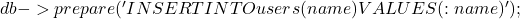 $stmt = $db->prepare('INSERT INTO users (name) VALUES (:name)');