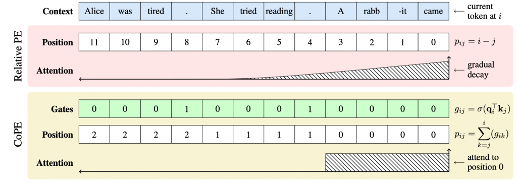 Contextual Position Encoding (CoPE) 的核心思想是将位置的定义从「固定的 token 计数」扩展到「基于语境的动态计数」。这意味着,CoPE 不仅可以编码 token 的位置,还可以编码更抽象的单位(如单词、句子或段落)的相对位置。