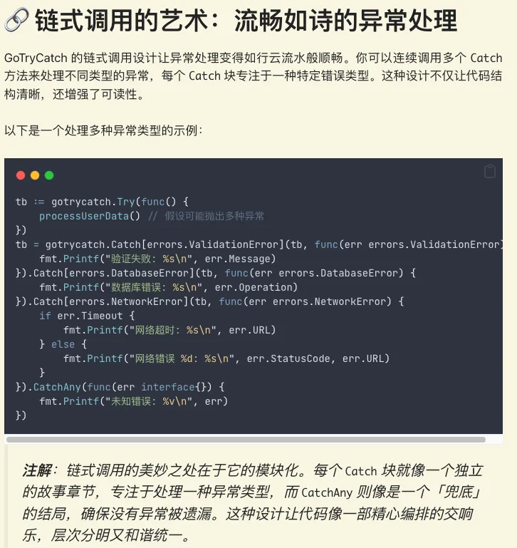 注解:零依赖的设计让 GoTryCatch 像一辆轻便的自行车,无需额外的「行李」就能在 Go 的编程世界中自由驰骋。同时,基于 panic/recover 的实现确保了性能的高效,就像在高速公路上行驶的跑车,速度快且稳定。